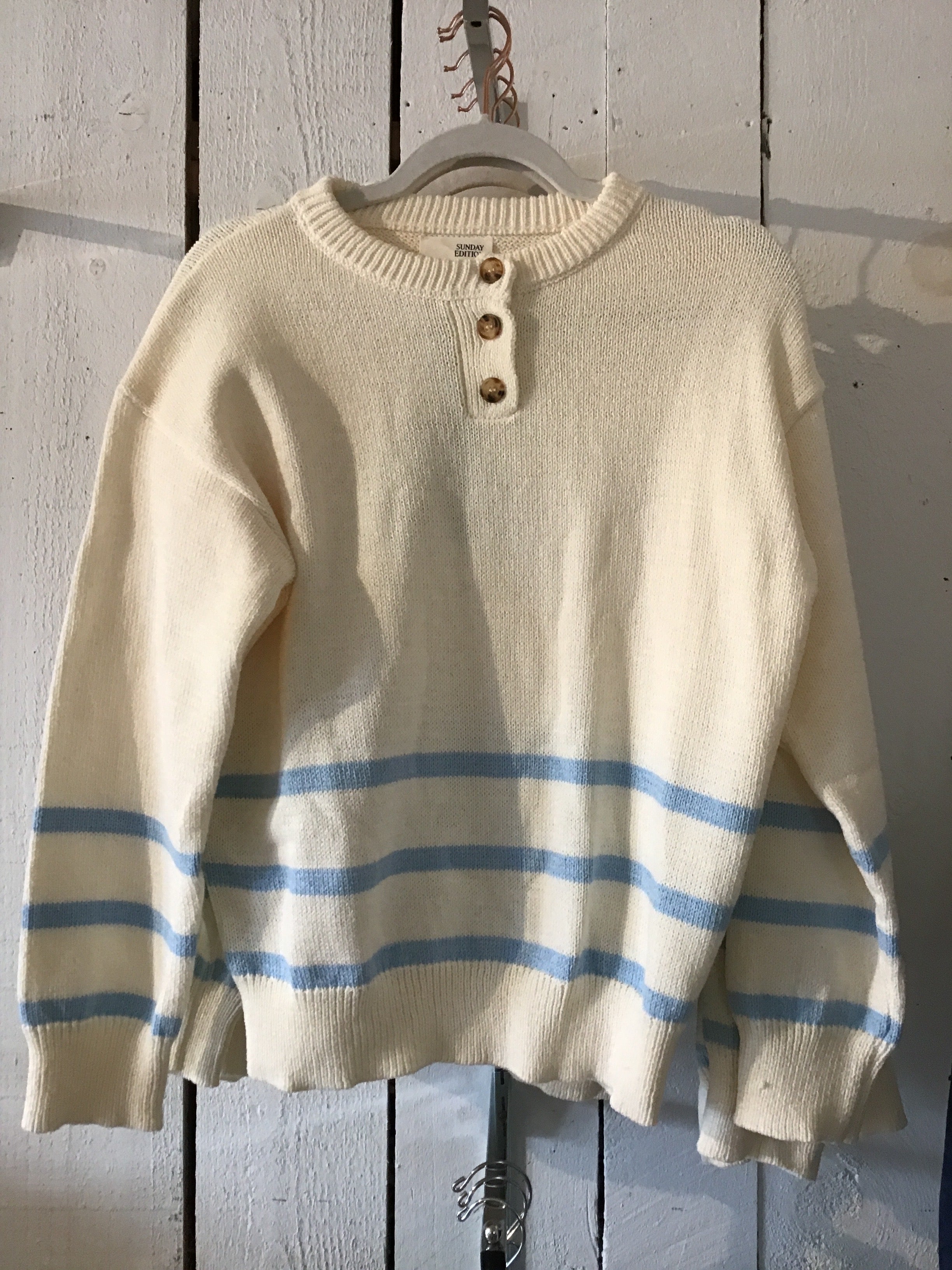 Nice lighter weight sweater with blue stripes, runs a bit bigger as I went with small and usually a medium.
