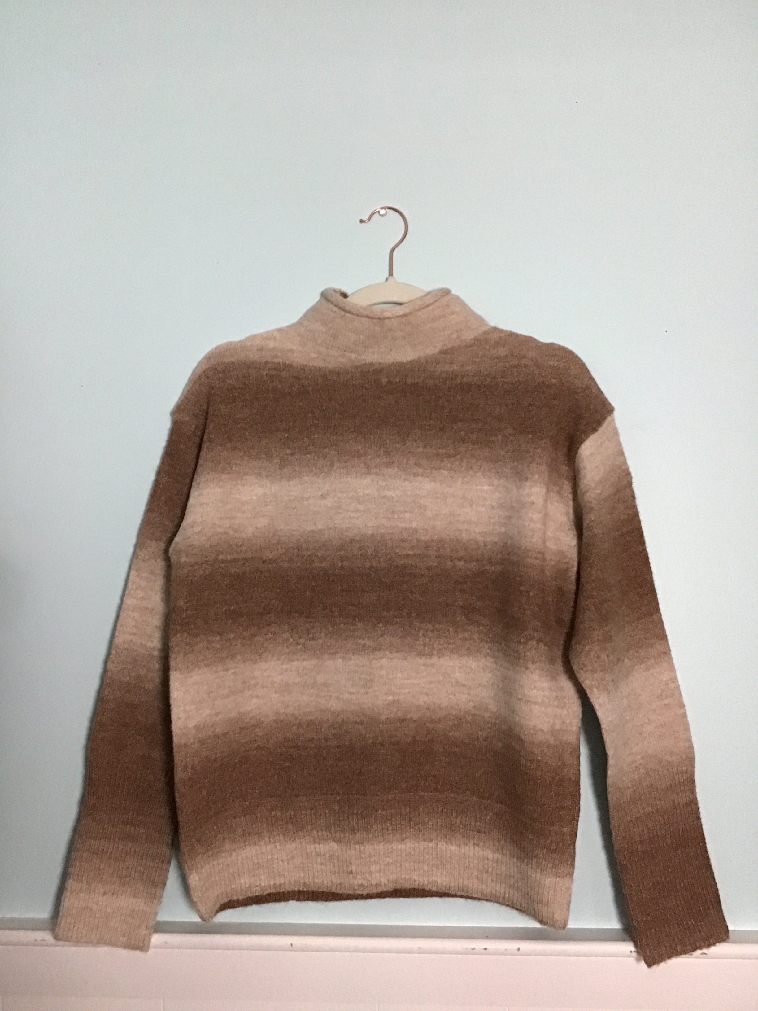 Cozy up in this roll neck sweater that's basically a warm hug wrapped in wool blend goodness. The tonal gradient stripes add just enough visual interest to keep things from getting boring, while the soft fabric blend keeps you comfortable all day long. Perfect for layering or going solo when the temperature drops. Your go-to piece for looking effortlessly put-together while staying toasty.
