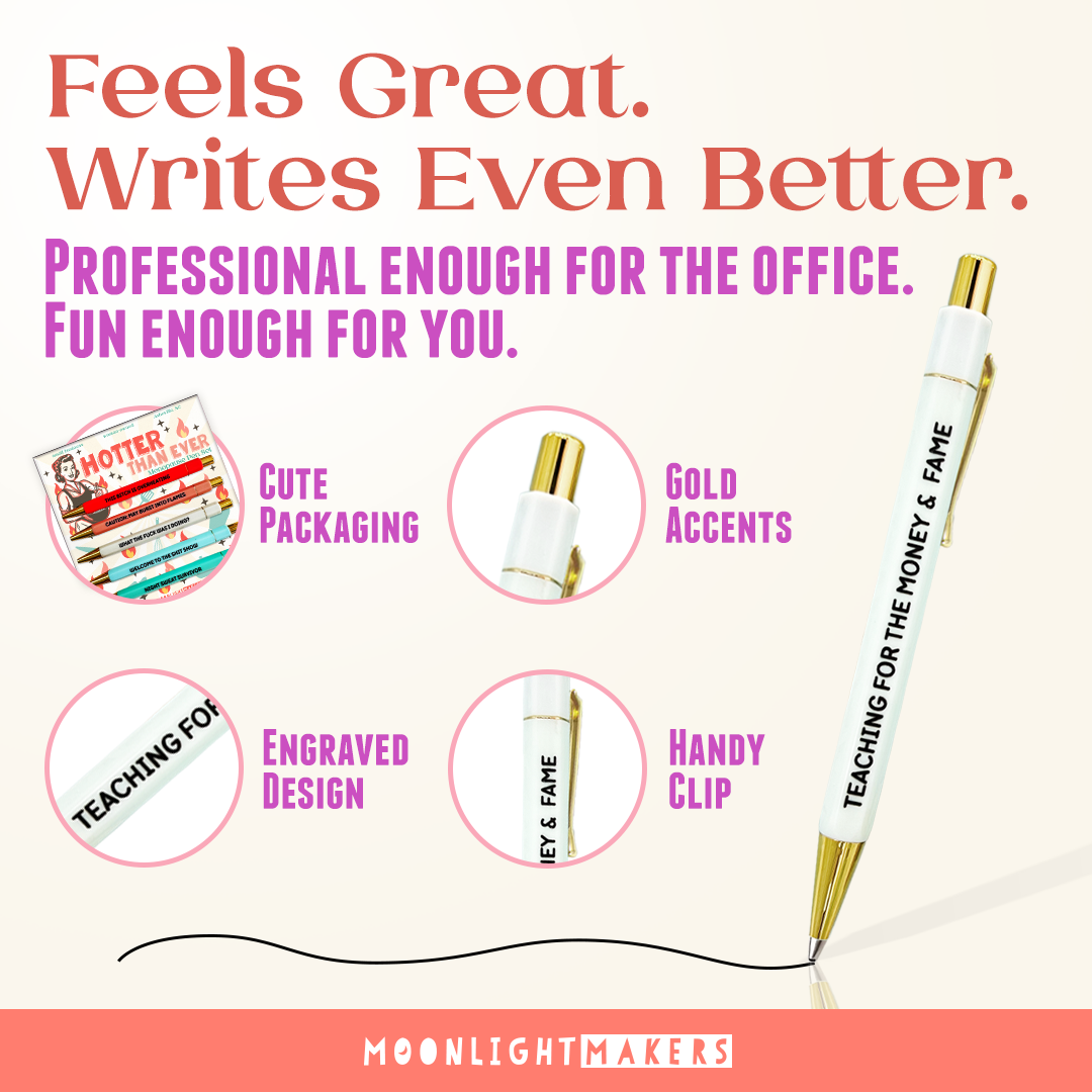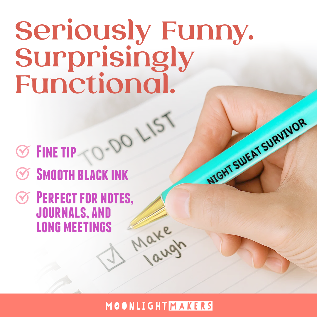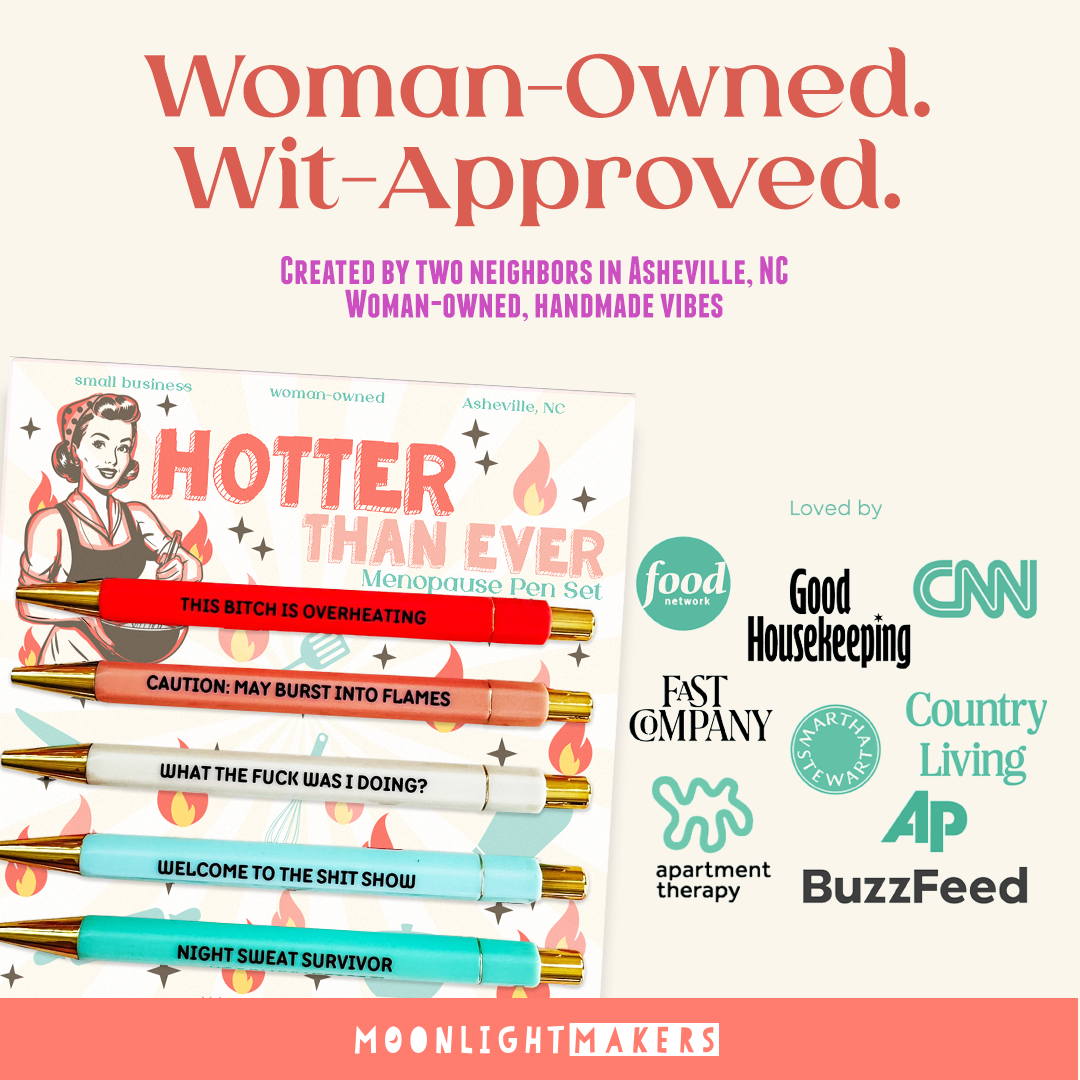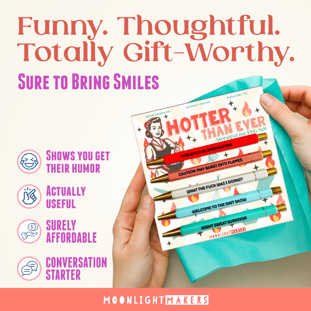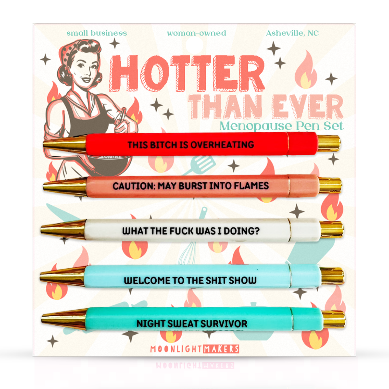 Keywords: menopause gift, funny menopause pens, black ink pens, gold accents, boutique pen set for women, sassy writing pens, hot flash humor gift, stocking stuffer for women, pen set for moms, funny home office supplies, pen pack for her, unique women’s gift, wholesale boutique stationery, self-care humor, lifestyle gift shop item, pen set for midlife women, over 50 gift ideas, novelty writing pens for women, wellness humor gift, boutique desk accessories, 50th bday gifts, 60th bday gifts, gifts for older women, aging humor, women's humor, menopause humor, 45th bday gift, 40s, 50s, 60s, empowering gifts for women, inspirational, positivity