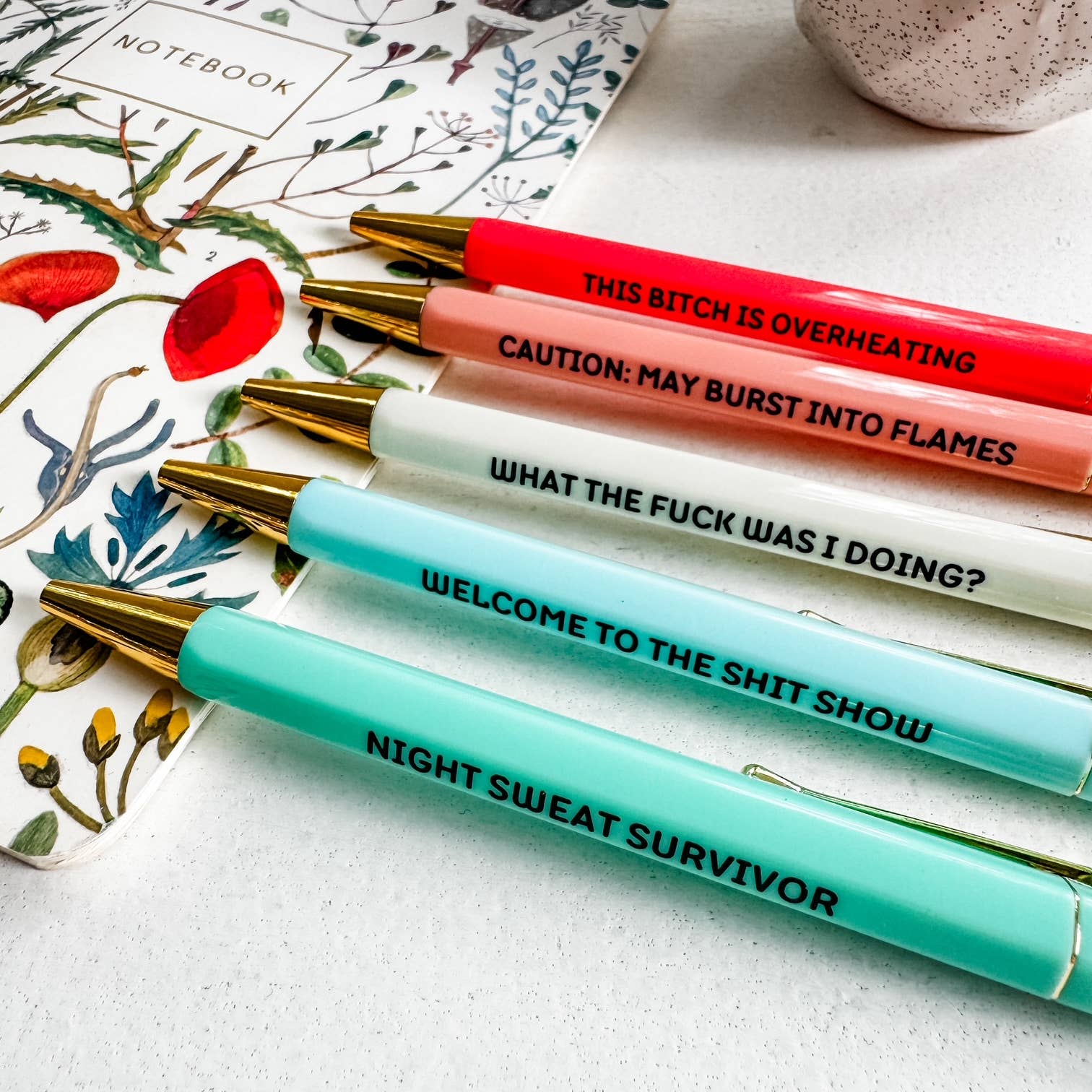 - Set of 5 black ink pens with gold accents, designed for women navigating menopause with humor.