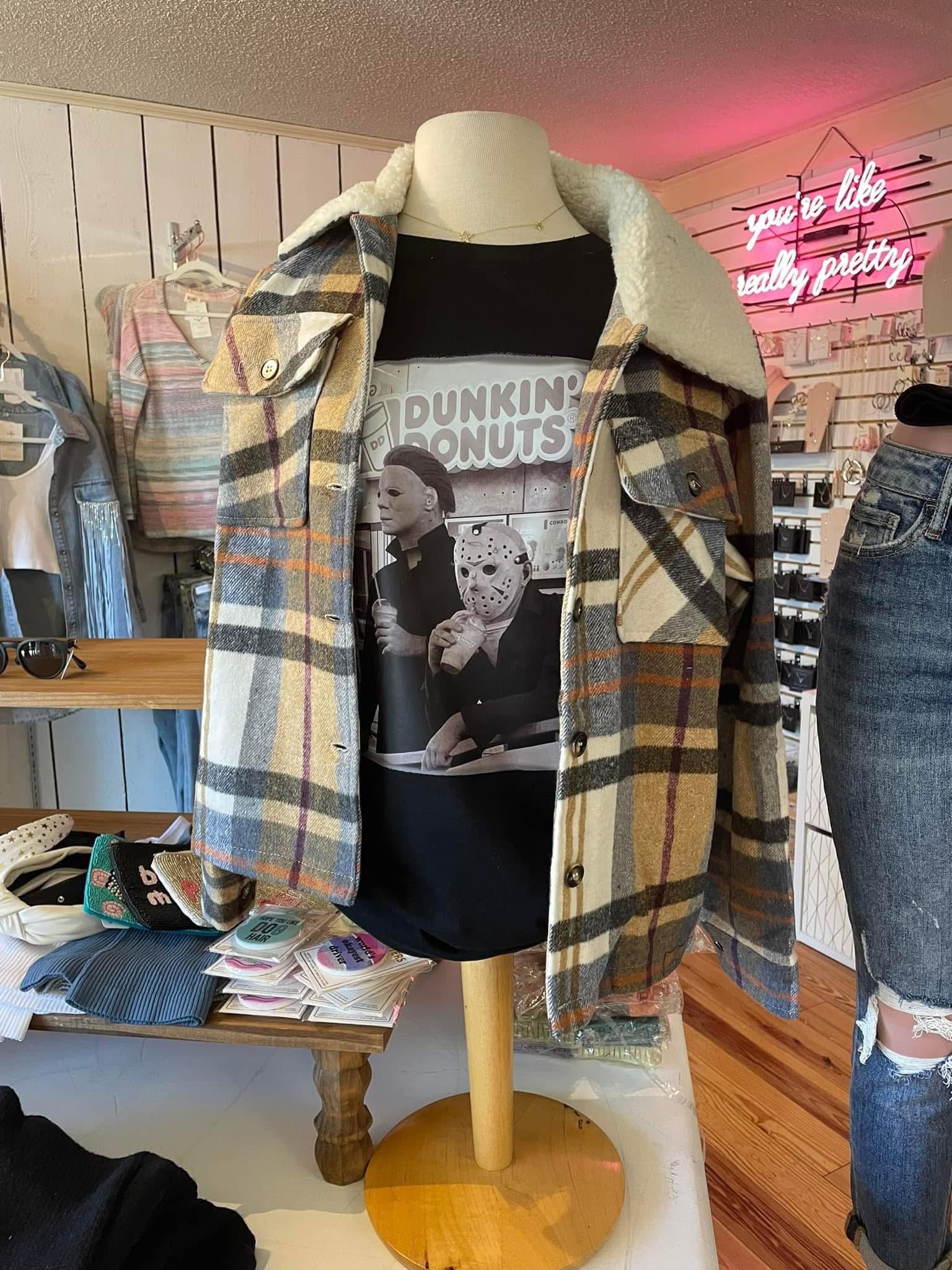 Unite your love for horror icons and caffeine with our Michael Myers and Jason Dunkin coffee tee. Perfect for any Halloween enthusiast (or any morning zombie). Sip your favorite brew in style and show off your quirky side with this playful tee. Limited edition, get yours before they disappear like a ghost!
