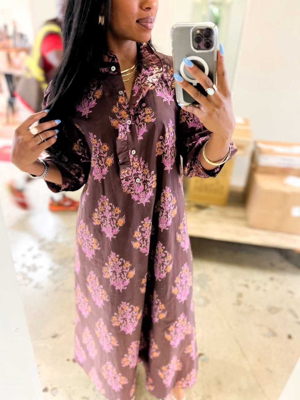 The Marigold, rich, elegant and made for the season.  The Marigold is a chocolate maxi dress with a plum and gold print that feels like fall in the most elevated way. With long sleeves and a flowing silhouette, it's perfect for Thanksgiving dinner, holiday gatherings, or any night you want to look polished yet comfortable. Pair with boots for a cozy vibe or heels for an effortless evening look.